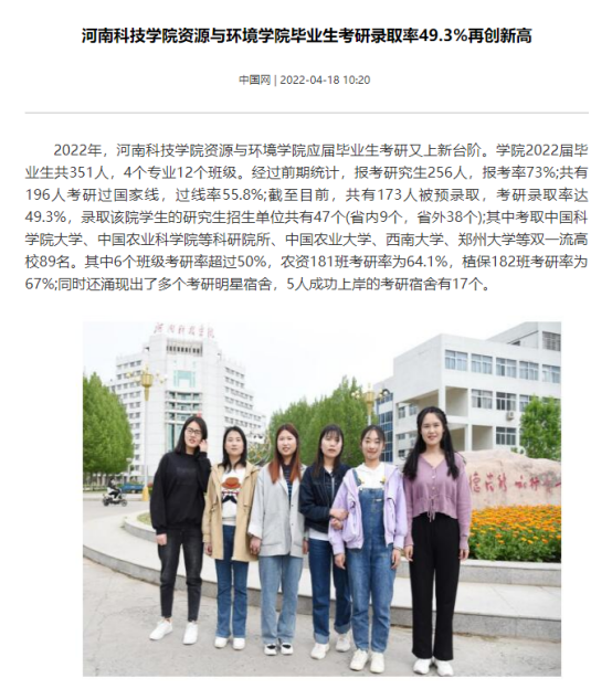 【中国网】《河南科技学院资源与环境学院毕业生考研录取率49.3%再创新高》
