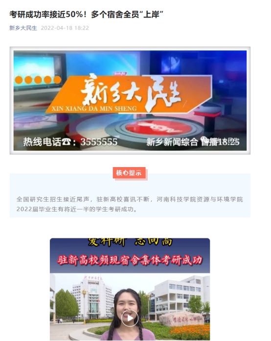 【新乡电视台】《河南科技学院资环学院:17个寝室几乎全部上岸 考研成功率接近50%》