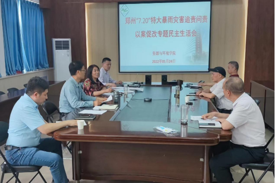 5月24日,资源与环境学院在实验楼E307会议室召开郑州“7·20”特大暴雨灾害追责问责案件以案促改专题民主生活会。学院班子成员参加会议,会议由院党委书记高扬帆主持。