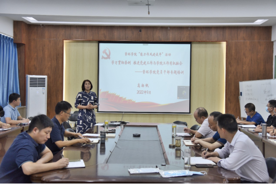 会上,高扬帆为学院全体党员干部做了“学习贯彻条例,推进党建工作与学院工作有机融合”的专题报告。她从《中国共产党普通高等学校组织工作条例》修订的背景及意义、修订遵循的主要原则、修订的重点内容和学习贯彻要求、实现党建工作与学院工作有机融合等五个方面进行了详细解读。她要求,全体党员要全面掌握《条例》的丰富内涵,深刻领会《条例》的精神实质,真正做到熟悉掌握《条例》,自觉贯彻《条例》,实现党建工作与学院工作的有机融合,推进学院发展迈上新台阶。