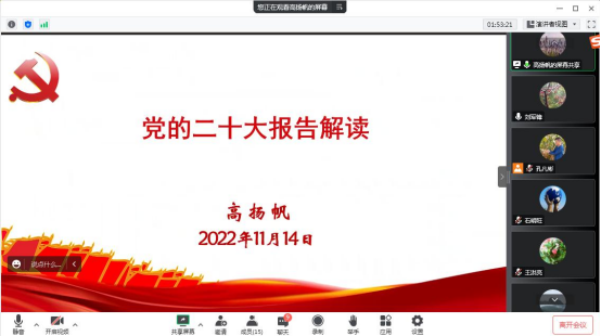 高扬帆对党的二十大精神作宣讲报告,重点围绕深刻把握党的二十大的重大意义、深刻把握过去五年的工作和新时代十年的伟大变革、深刻把握开辟马克思主义中国化时代化新境界、深刻把握以中国式现代化推进中华民族伟大复兴的使命任务等方面,结合自身学习、感悟和工作实际,对党的二十大精神进行系统、深刻的解读。