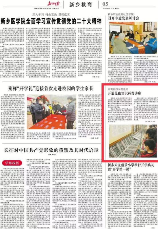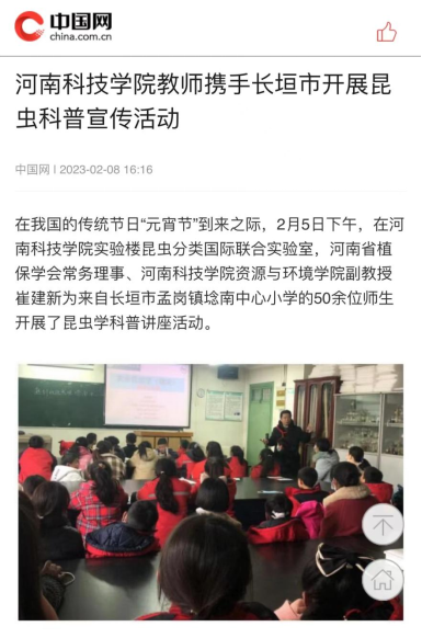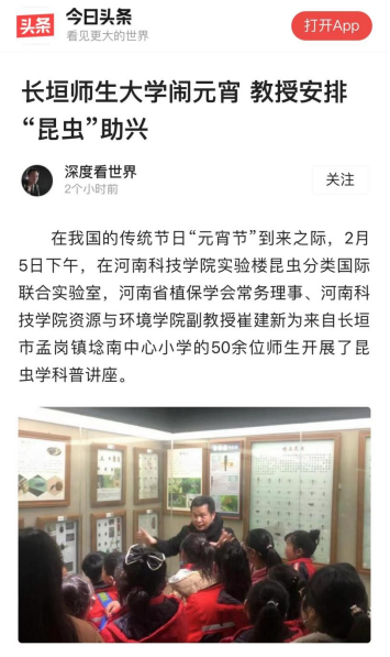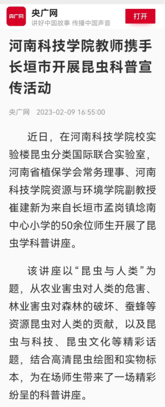 近日,【央广网】、【中国网】、【今日头条】、【新乡日报】等多家媒体平台报道资源与环境学院教师携手长垣市开展昆虫科普宣传活动。