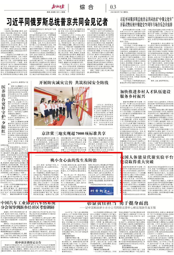 5月17日,资源与环境学院昆虫学副教授吴利民撰写的题为《桃小食心虫的发生与防治》的文章在【新乡日报】刊发。文章对山楂果树常见的桃小食心虫病害进行阐述,并详细介绍该病虫害的防治方法,为农户诊断和预防此类病虫害提供了科学途径。