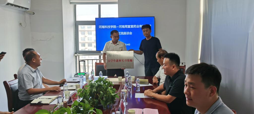 在河南周富堂药业有限公司,我校优秀毕业生、公司总经理周志强,邀请了确山县人大常委会副主任、县中药材办公室主任张保红,驻马店市中药材协会会长游正林以及县农业局、农机中心、中药材协会等部门相关负责人一同会见了王鲁伟一行。周志强介绍了个人的创业历程、公司的基本情况;王鲁伟简要介绍了学院的发展概况,对周志强在事业发展中所取得的成绩给予了充分的肯定,双方就中药材产业发展、技术服务与合作等方面进行了深入的交流,并举行了“河南科技学院大学生就业创业实习基地”授牌仪式。