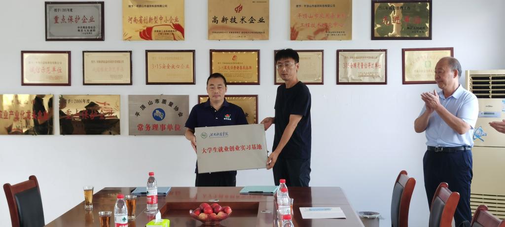 在平顶山市益农科技有限公司,公司董事长薛国强、我校优秀毕业生丁林伟经理、及公司相关负责人,首先陪同王鲁伟一行调研了公司生产基地及研发中心;在座谈会中,王鲁伟介绍了学院基本情况,丁林伟介绍了公司的发展历程及成绩,双方在校企合作、平台建设及学生培养等方面进行了深入交流,并举行了“河南科技学院大学生就业创业实习基地”授牌仪式。
