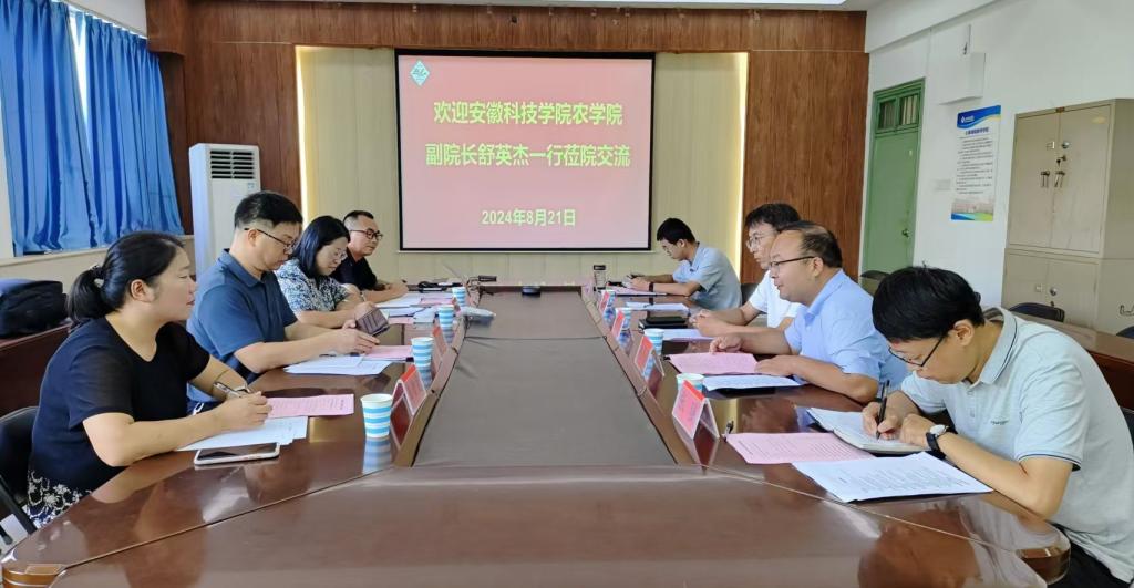 8月21日上午,安徽科技学院农学院副院长舒英杰一行4人来我院调研交流。资源与环境学院党委书记王鲁伟、院长刘润强及学院相关教师参加了调研。