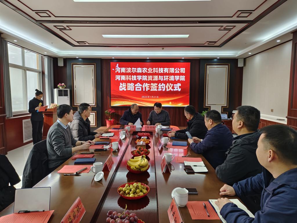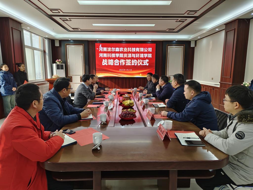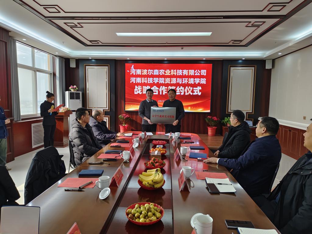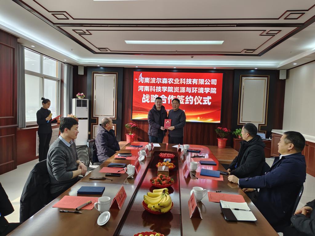 在河南波尔森农业科技有限公司,董事长鲁志伟对刘军锋一行的到来表示欢迎;行政总监郭水利介绍了公司的发展历史、公司规模、企业文化、产品与服务等情况;李松伟介绍了学校的基本情况,学院的历史沿革、师资队伍、科研平台、科研成果、专业优势及特色、校企合作等情况;刘军峰代表学院与波尔森董事长鲁志伟签订了校企战略合作协议;孔凡彬为董事长鲁志伟颁发了河南科技学院资源与环境学院暨“生物农药创制与应用行业学院”客座教授聘书;并举行了“河南科技学院大学生就业实习基地”授牌仪式。双方在人才培养、项目合作等方面进行了深入的交流。随后刘军锋一行调研了公司的生产基地、研发中心等。