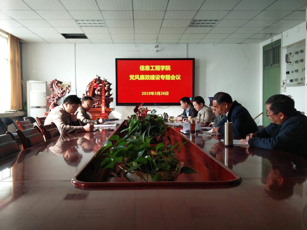 2019年3月26日,信息工程学院党政领导班子全体成员在0#502会议室,召开信息工程学院2019年党风廉政建设工作专题会议。会议由党委书记郎瑞红主持。