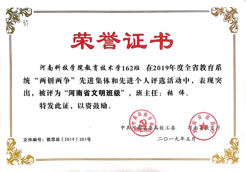 近日,根据中共河南省委高校工委、河南省教育厅《关于公布2019年度全省教育系统“两创两争”活动先进集体和先进个人评选结果的通知》,我院教育技术学162班获得2019年度“河南省文明班级”的荣誉称号。