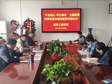 11月8日,信息工程学院党政班子在0#楼502会议室召开“不忘初心、牢记使命”主题教育对照党章党规找差距专题会议,学院领导班子成员参加会议,学院党委书记郎瑞红主持会议。