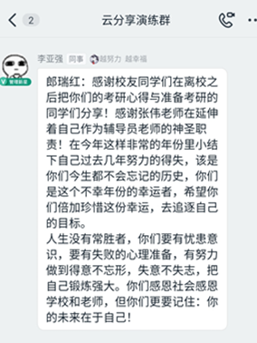 会上,考取研究生的学长学姐向同学们讲述自己的考研经验,总结考研准备中和考研进行中的一些重点。并介绍了他们在考研过程中总结的经验和学习方法,强调真题要反复练习,寻找难点强化练习。随后,他们针对同学们提出的考研相关问题进行了详细解答,并强调身体是革命的本钱,在埋头苦干时不要忘记锻炼身体、适当放松,只有劳逸结合才是打赢一场持久战的关键。交流会最后,学长学姐鼓励同学们积极准备、认真学习,调整好心态,从容不迫地面对考研。会议结束后,我院党委书记郎瑞红对考研毕业生们表示感谢,并送出美好的祝福。