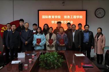 10月28日下午,国际教育学院与信息工程学院在0#502召开学生工作交流会。国际教育学院党总支书记张平,党总支副书记兼副院长吴艳兵,学生科科长兼团委书记李威,我院党委书记郎瑞红,党委副书记张建设,副处级党建组织员王明艳,以及担任国际教育学院2020级新生代理班主任的我院9名同学参加。会议由王明艳主持。