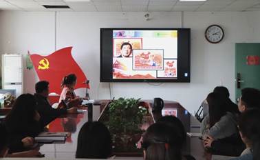 主讲人以中国第一枚邮票为开端,深化党员们对邮票的认知。随后,她依次介绍了新中国邮票的五个发展阶段、各阶段的发展特点、邮票的分类。最后,主讲人联系现代生活对当代大学生“走进”个性化邮票表达希冀。讲解完毕后,张建设指出,邮票展示了较为丰富的中国发展史,每一位当代大学生应当在邮票中感受鲜活历史,激荡爱国情怀。会议结束,全体参会人员前往邮票展区进行参观,近距离感受到了邮票的精美与独特。