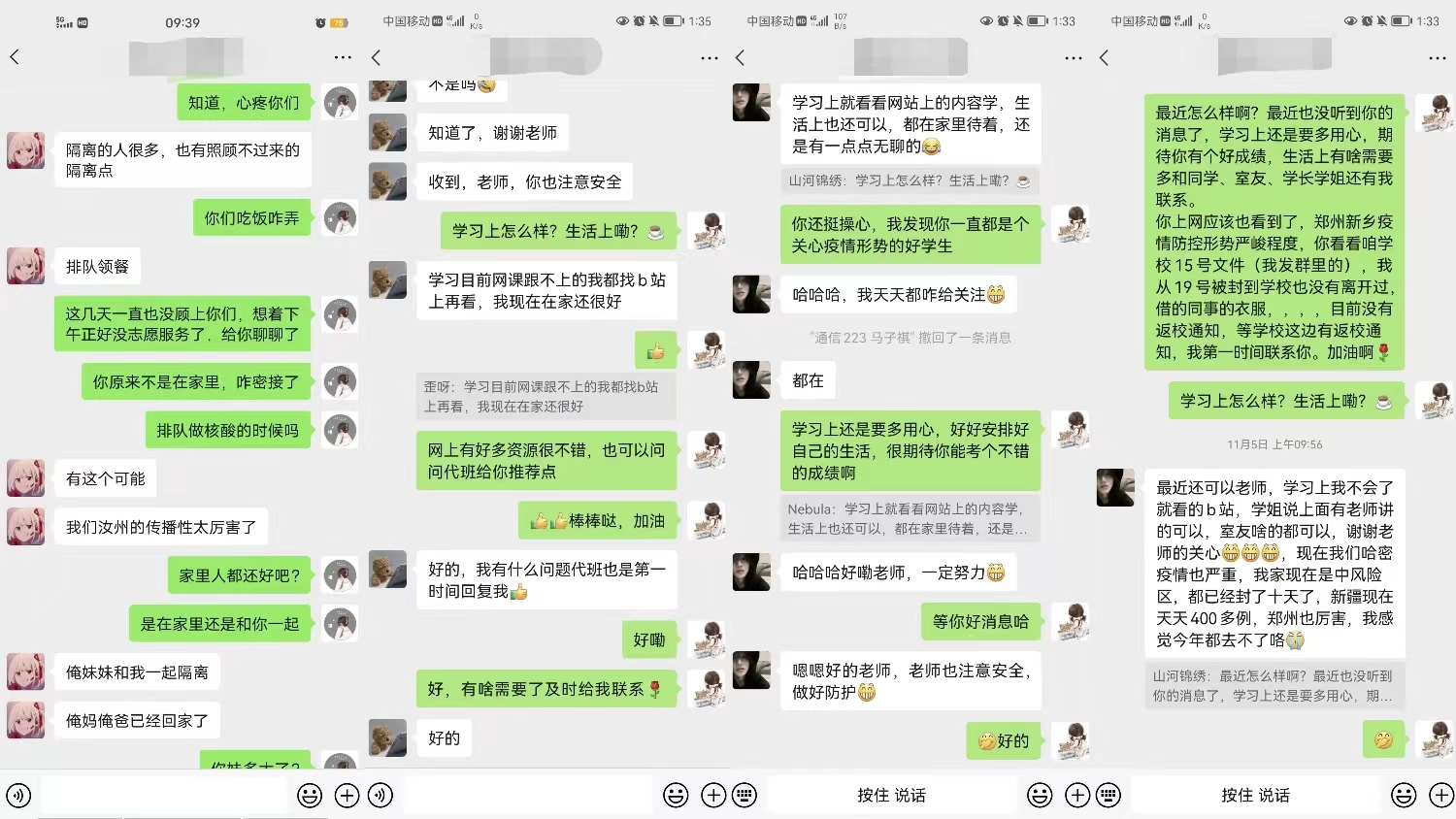 携手共克时艰,让学生暖心。隔屏不隔爱,师生心连心。学院及时成立帮扶小组,党政领导、专业课老师、各年级辅导员以及高年级学生骨干积极参与,分别针对学生在日常学习、生活、就业、考研等方面遇到的问题予以及时帮助。从推送课程学习资料、就业信息到帮助学生复印材料,从关注学生实习状况到掌握新生思想动态,及时解决学生急难愁盼各种困难。