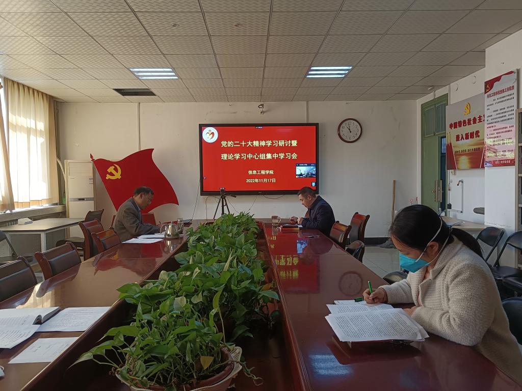 11月17日上午,信息工程学院党委召开党的二十大精神专题学习研讨暨党委理论学习中心组集中学习会,深入学习研讨党的二十大精神。学院党委书记郎瑞红主持会议,党委理论学习中心组成员、全体党支部书记参加会议。
