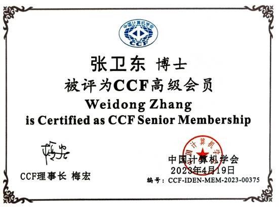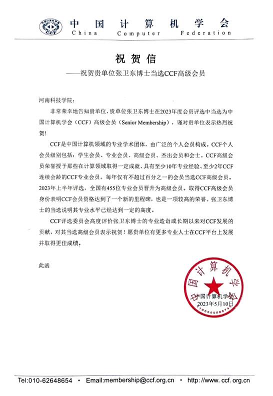 近日,中国计算机学会(CCF)向我校发来贺信:祝贺我校信息工程学院张卫东博士当选2023年CCF高级会员。CCF评审委员会高度评价了张卫东博士的专业造诣和对CCF发展的贡献,同时欢迎我校有更多计算机专业人士在CCF平台上发展,并取得优异的成绩。