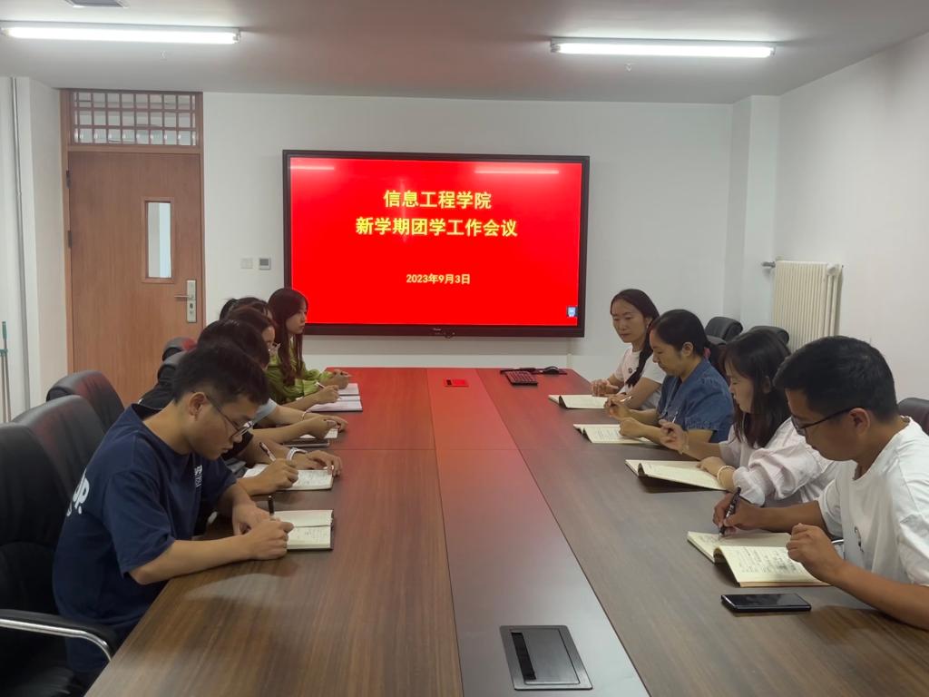 为有效提高团学队伍战斗力与凝聚力,推进新学期团学工作高质量开展,9月3日下午,信息工程学院在弘文楼B404会议室召开新学期团学工作会议。学院党委副书记王明艳,辅导员朱琳、张宁宁、林海波以及学生会主席团成员参加。会议由王明艳主持。