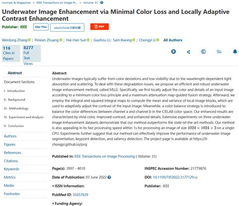 信息工程学院张卫东博士课题组在图像处理领域Top期刊IEEE Transactions on Image Processing (IEEE TIP)发表了研究成果“Underwater Image Enhancement via Minimal ColorLoss and Locally Adaptive Contrast Enhancement”。张卫东博士为论文的第一作者。IEEE TIP是中科院SCI一区Top期刊(IF:11.04)、中国计算机学会(CCF)推荐A类期刊,是图像处理领域公认的国际顶级期刊。IEEETIP刊出的研究成果代表了图像处理领域的重大进展,在理论和工程应用上对图像处理相关领域都具有重要的推动作用。