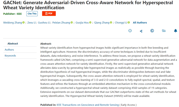 近日,信息工程学院(计算机应用研究所)与南开大学、北京科技大学等高校的研究团队合作,在农业高光谱领域取得重要研究进展,张卫东博士在中科院一区Top期刊《IEEE Transactions on Geoscience and Remote Sensing》上发表了题为“Generate Adversarial-Driven Cross-Aware Network for Hyperspectral Wheat Variety Identification”的研究成果。