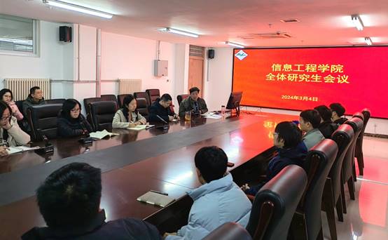 为扎实做好研究生管理工作,3月4日下午,信息工程学院在弘文楼413会议室召开全体研究生会议。院党委书记李印、院长李国厚、党委副书记王明艳、副院长冯小燕、研究生秘书张卫东、辅导员陈佩佩以及全体研究生参加会议。会议由冯小燕主持。