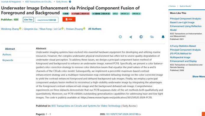 近日,信息工程学院(计算机应用研究所)在视频多媒体领域国际顶级学术期刊《IEEE Transactions on Circuits and Systems for Video Technology》(IF=8.40,中科院一区,TOP期刊)上发表了题为《Underwater ImageEnhancement via Principal Component Fusion of Foreground and Background》的学术论文。论文第一作者为我院张卫东博士、第二作者为硕士研究生刘庆敏同学。