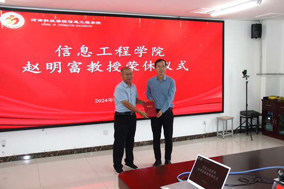 院长李国厚宣读了学校关于赵明富教授的荣休通知,详细介绍了赵明富教授的工作历程。李波为赵明富教授颁发了荣休证书并赠送荣休纪念品。院长李国厚在发言中表示,希望赵明富教授在安享退休生活之余,继续建言献策、发挥余热,持续关心、关注和支持学院事业发展。