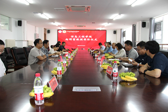 岁月峥嵘如歌,教育芳华不朽。9月26日下午,信息工程学院在弘文楼B413会议室举行赵明富教授荣休仪式座谈会,共叙如歌岁月,共话未来发展。研究生处处长李波,机电学院党委书记张雅凌,计算机科学与技术学院党委书记周启、党委副书记董华明、副院长王建平、副院长李学勇,信息工程学院全体班子成员及教师代表参加了本次座谈会。座谈会由信息工程学院党委书记李印主持。