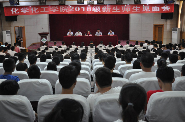 9月10日下午,化学化工学院在图教201召开2018级新生师生见面会,学院党委书记赵亦芳、院长张裕平、党委副书记朱宏、副院长连照勋、谷永庆出席会议,全体辅导员和2018级374名新同学参加会议。会议由学院党委副书记朱宏主持。