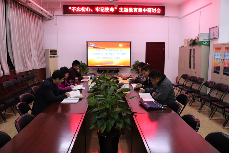 10月24日晚,化学化工学院党委理论学习中心组在学院会议室举行“不忘初心、牢记使命”主题教育第三次集中学习研讨。院党委委员、班子成员参加了学习研讨会。