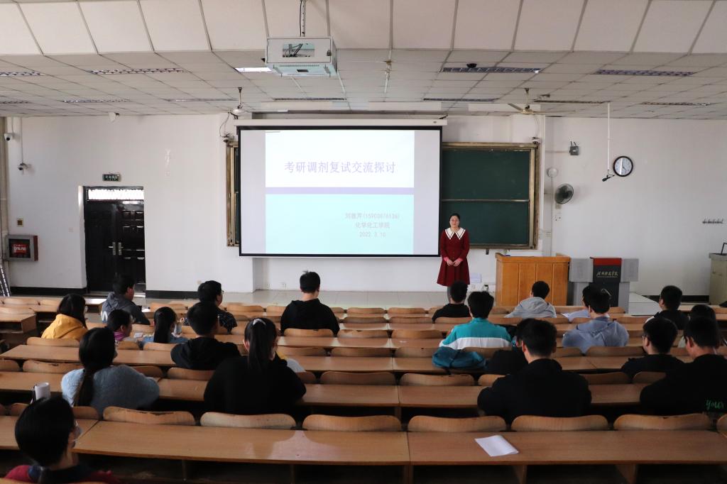 为激发学习动力,帮助广大学生顺利考取研究生,3月10日上午,化学化工学院在0#合四教室举行“化梦领航工程”第十二期交流会。学院2022届考研学生代表参加了会议。会议由院党委副书记朱宏主持。