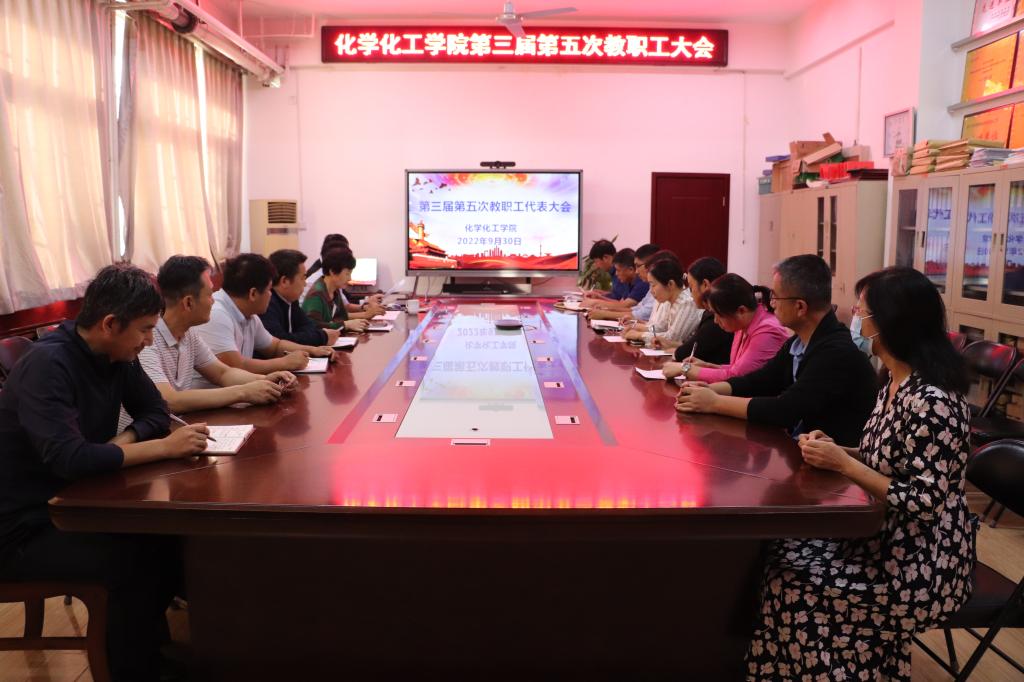 9月30日上午,化学化工学院召开第三届第五次教职工大会。会议采取线上线下相结合方式召开,学院班子成员和全体教职工参加会议,会议由院党委副书记、分工会主席朱宏主持。