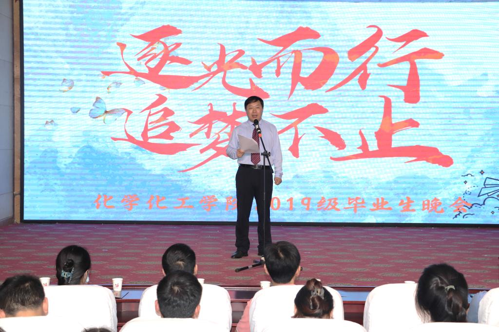 白驹过隙,时光荏苒。5月20日晚,化学化工学院在图教201举办以“逐光而行,追梦不止”为主题的2023届毕业晚会。院党委书记孙震寰、党委副书记谷永庆、副院长杨理、科研秘书张万庆、研究生秘书王松林、教师代表、全体辅导员以及2023届毕业生参加了晚会。