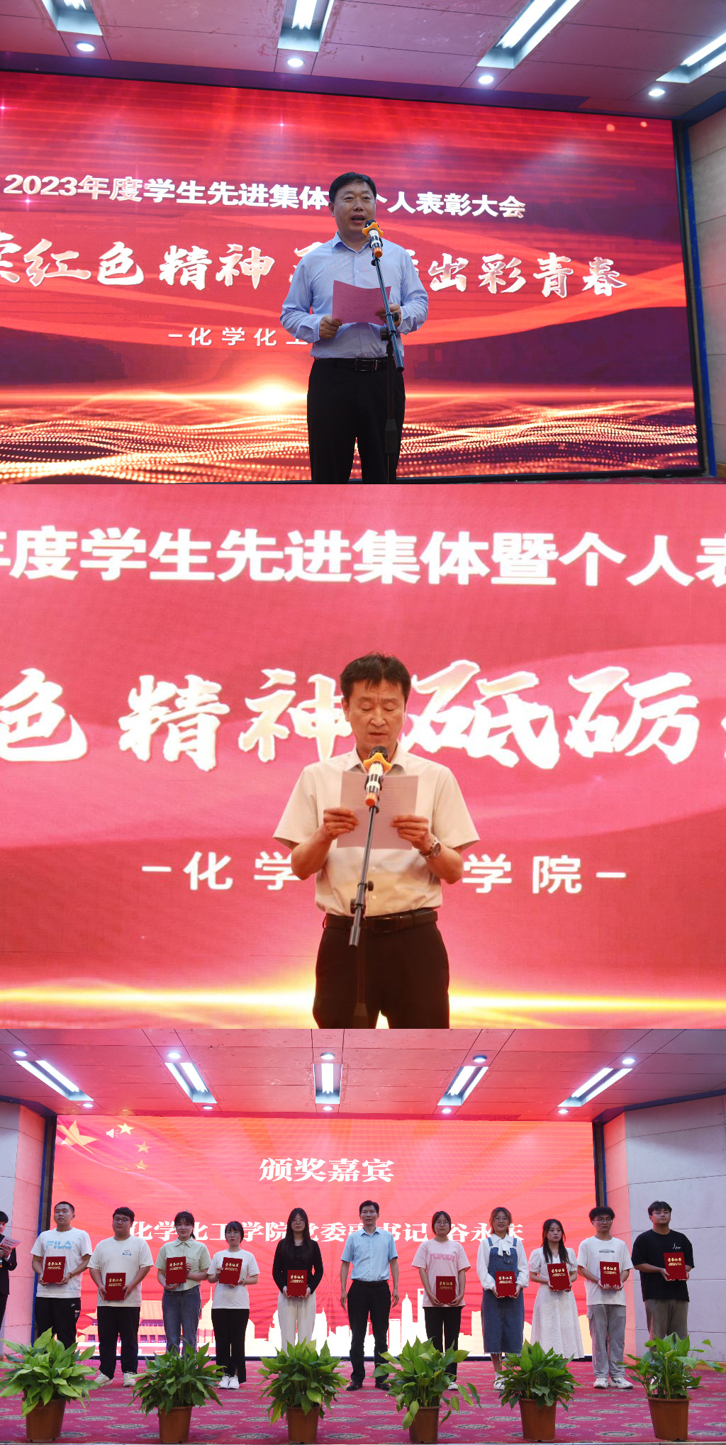 5月24日晚,化学化工学院在图教201举行“赓续红色精神,砥砺出彩青春”2023年学生先进集体暨个人表彰大会。校党委宣传部部长翟居怀,团委书记张永波,教务处处长杨宾峰,党委学工部部长、学生处处长冀红举,党委研工部部长、研究生处处长李波,体委办公室副主任、体育学院院长高泳,音乐与舞蹈学院党委书记魏军鹏,音乐与舞蹈学院院长姬英涛应邀参加了会议,学院全体党政领导,教师代表以及300余名学生参加了会议。