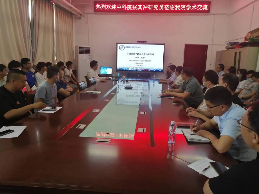 为加强学术交流和化学学科建设,6月8日下午,化学化工学院邀请中国科学院苏州纳米技术与纳米仿生研究所研究员张其冲在学院一楼会议室作了题为“纤维状电子器件与多功能集成”的学术报告。学院领导班子成员、相关教师及研究生代表等60余人参加了报告会。会议由副院长杨理主持。