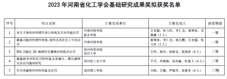 近日,在河南省化工学会科学技术奖评审工作中,基础研究共评出5项成果,其中河南科技学院化学化工学院光电功能材料团队申报的“多孔半导体材料理性设计构筑及光电性能应用”和计算化学研究所申报的“碳基功能材料理性构筑、修饰及其在化工中的应用”分别获得基础研究成果奖一等奖和二等奖。该成果的获得为化学化工学院下一步申报中国化工学会科学技术奖打下了坚实的基础。