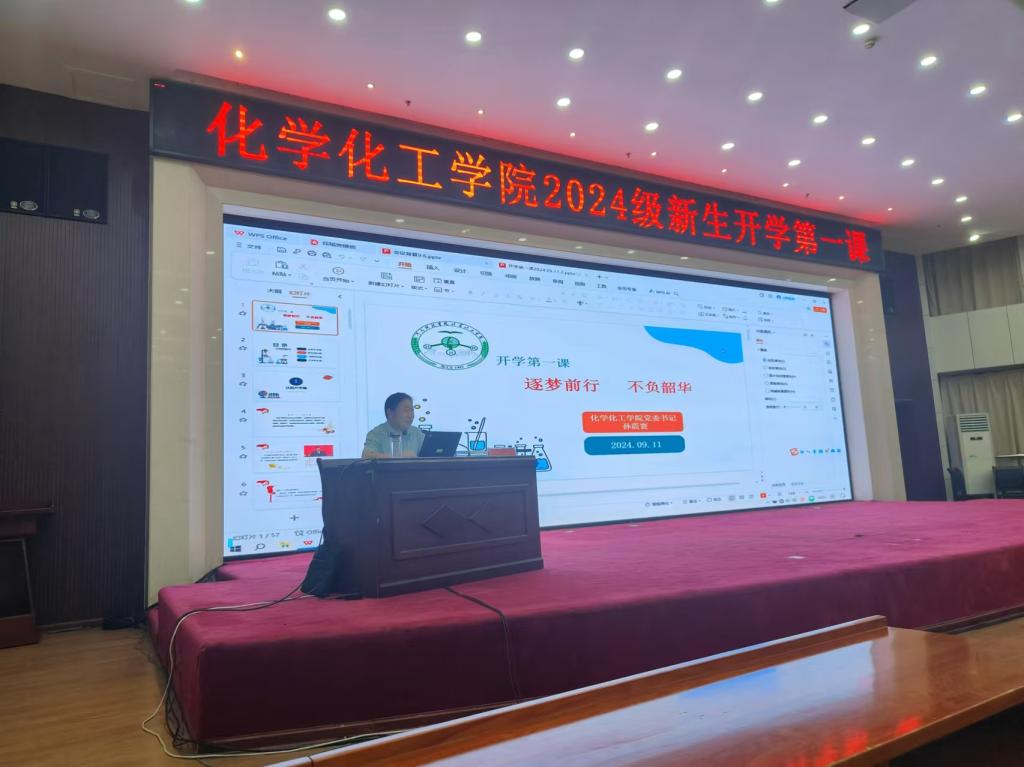 根据学校入学教育的安排,结合化学化工学院的实际情况,9月11日晚,化学化工学院党委书记孙震寰在办公楼308会议室为2024级新生讲授“开学第一课”。