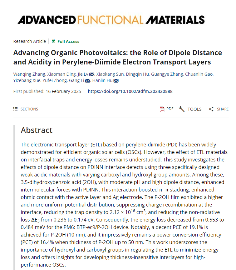 近日,我校化学化工学院张万庆副教授团队在国际顶级期刊《Advanced Functional Materials》发表了题为“Advancing Organic Photovoltaics: The Role of Dipole Distance and Acidity in Perylene-Diimide Electron Transport Layers”的最新研究成果。该期刊2025年的最新影响因子为18.5,是材料与化学领域的公认顶级期刊,不仅位列中科院大类/小类一区Top期刊,还被国际权威的自然指数评选为顶级期刊之一。在此次成果中,河南科技学院为第一完成单位,张万庆副教授担任论文的第一作者。