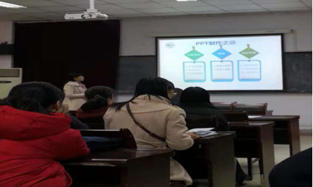 ——11月15日下午,针对教学中的共性问题,学院请邱兴宇、杜平两位老师对全体教师进行课件制作培训,两位教师从PPT设计的基本原则,技能技巧,PPT制作之忌等方面进行详细讲解,丰富详实,重点突出,有的放矢,两位老师还在“教学微信群”中分享了优秀课件,老师们受益匪浅;