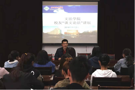 11月2日,文法学院分别在506学术报告厅和模拟法庭举办校友“谈文论法”讲坛,优秀校友岁宏阳、潘沈斌、刘妍、葛二磊、李行行、王彦等六位校友应邀担任此次讲坛主讲人。文法学院学生代表共200余人参加了此次讲坛。