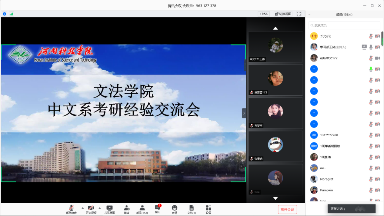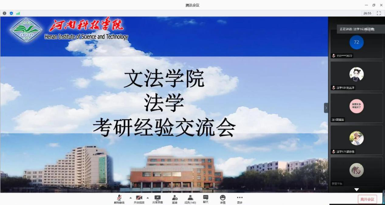 为帮助学生们深入了解考研的相关信息和政策,积累考研经验,制定正确的奋斗目标,6月3日至6日,文法学院通过网络的形式举办“群英齐聚,‘研’续梦想”考研经验交流会。文法学院中文系、法律系全体学生参加了此次考研经验交流会。