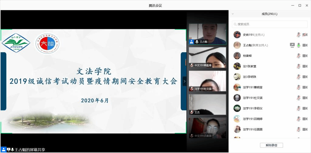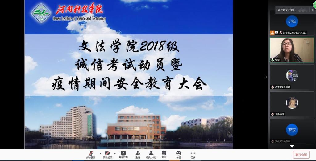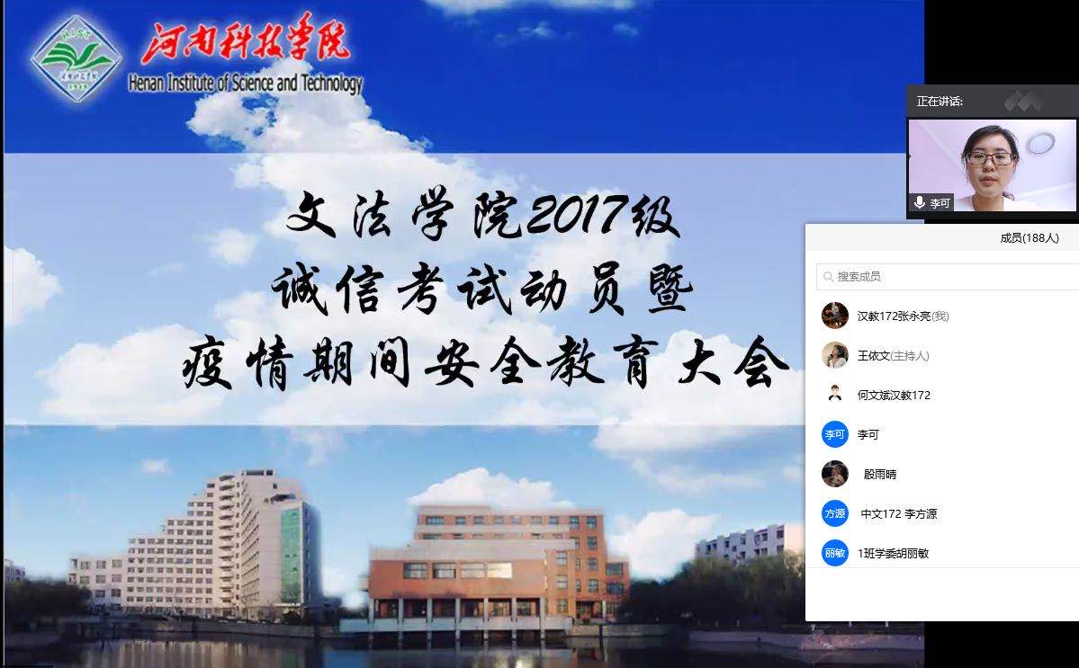为加强学院学风建设,严肃考风考纪,保证疫情期间期末考试顺利进行,增强学生居家安全防范意识,6月18日至19日,文法学院分别召开2017、2018、2019级线上诚信考试动员暨疫情期间安全教育大会。会议由各年级辅导员老师主持。