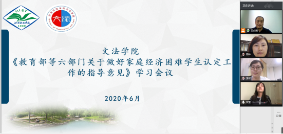 6月16日,文法学院在腾讯会议召开《教育部等六部门关于做好家庭经济困难学生认定工作的指导意见》学习会议。文法学院党委副书记邵帅,辅导员李可、王占魁、张慧参加了此次会议。会议由我院资助专管员王占魁老师主持。