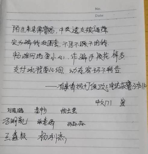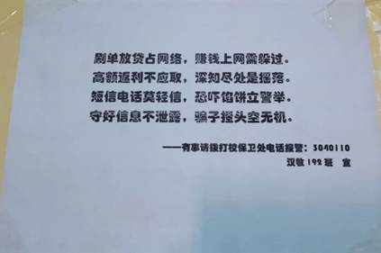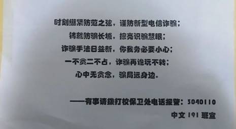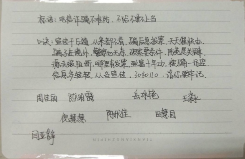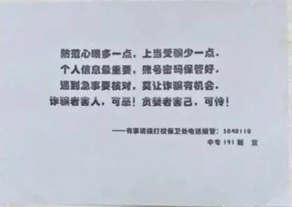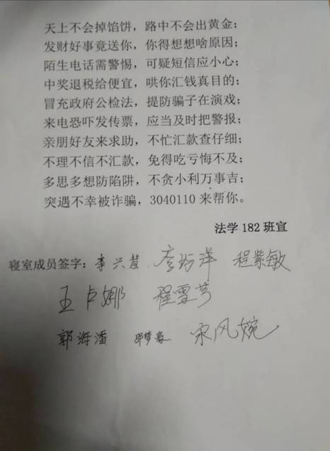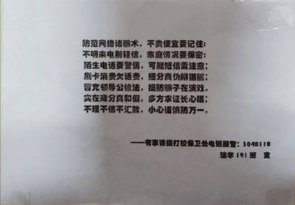 我院组织各班设计防诈骗宣传标语和口号,以宿舍为单位进行宣传学习,提醒学生们警惕网络防骗、注重个人信息安全。防诈骗宣传标语和口号简洁直观,进一步增强学生们的防范意识,学生们纷纷表示会加强学习防诈骗知识,时刻警惕电信网络诈骗。