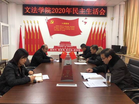 1月13日,文法学院在502会议室召开2020年处级党员领导干部民主生活会。文法学院党委书记王新宇、院长周全星,党委副书记邵帅、副院长王振军、副院长张东旭参加会议。会议由学院党委书记王新宇主持。