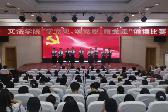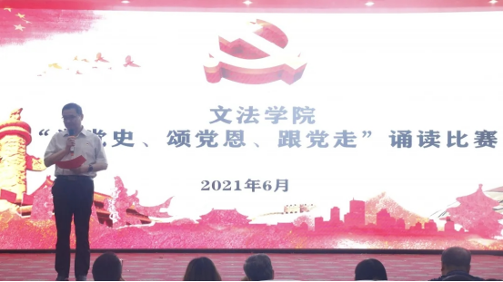 本次大赛分为初赛和决赛。经过初赛,共有九支参赛队伍入围决赛。选手们声情并茂地诵读了《永远跟党走》《大写的中国》《党旗颂》《我爱你,中国》等优秀作品,他们饱含深情、高昂嘹亮的诵读声带领现场观众们回顾波澜壮阔的百年党史,重温中国共产党那段难忘而又光辉的峥嵘岁月,礼赞伟大的党和祖国。赛后,文法学院党委书记王新宇对各参赛队伍的朗诵作品选材、舞台表现力和舞台感染力进行了点评,并强调了举办“学党史、颂党恩、跟党走”诵读比赛的目的和意义,勉励学生们要自觉加强党史理论学习,将“学史明理、学史增信、学史崇德、学史力行”真正融贯于心,从百年党史中汲取奋斗的力量,在为实现中国梦的不懈奋斗中书写人生华章!