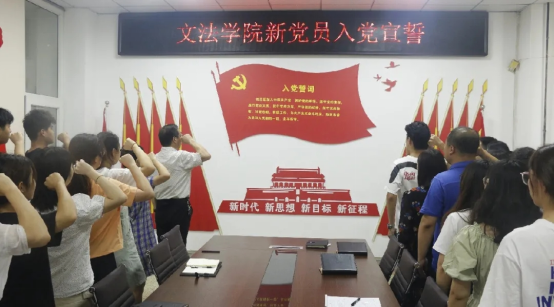 为纪念中国共产党建党100周年,推进党史学习教育深入开展,6月25日,文法学院开展新党员入党宣誓仪式,文法学院分党校校长、党委书记王新宇,分党校副校长、党委副书记邵帅,团委书记王占魁、研究生党支部书记张敏,团委副书记张慧,辅导员范三妞及新党员参加了此次活动。本次活动由王占魁主持。