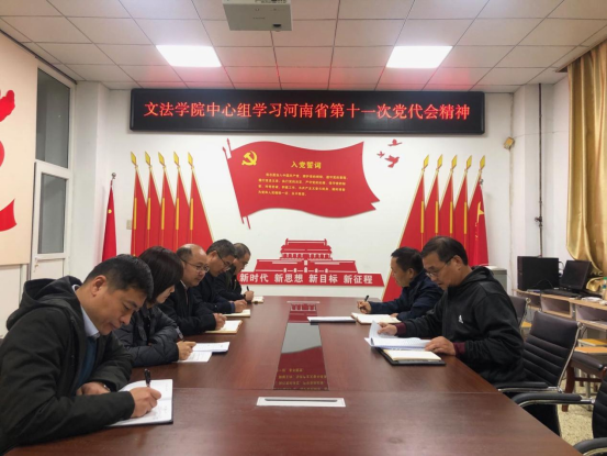 11月8日,文法学院在502会议室召开党委中心组理论学习会议,集中学习河南省第十一次党代会精神。学院党政班子成员、党委委员参加会议。会议由文法学院党委书记王新宇主持。