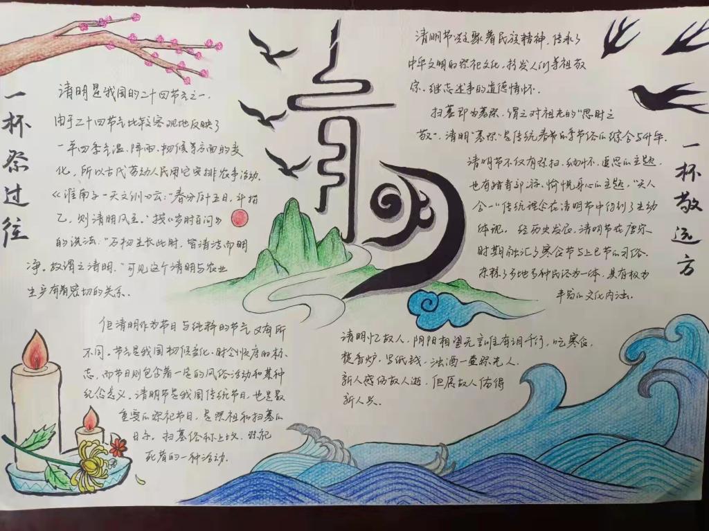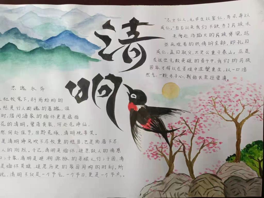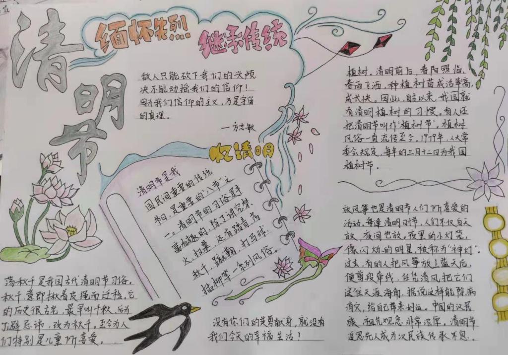 学生们踊跃参加清明节主题手抄报、绘制主题展板等活动,以遒劲的字迹传颂英烈的丰功伟绩,以生动的手抄报描绘先辈的不朽英魂,以清雅的图画展现清明习俗。用书画作品来弘扬传统文化,缅怀革命先烈。