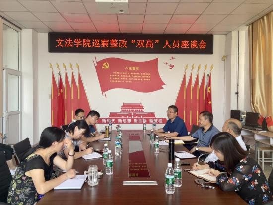 6月2日下午,结合校党委第四轮巡察整改要求,为进一步明确学科发展方向、凝聚科研团队,为学校“博大”工程做出应有贡献,文法学院党政班子在502党员活动室召开文法学院 “双高”人员座谈会。会议由副院长张东旭主持,参加会议有中国语言文学、法学两个一级学科的教授、博士、副教授16人。