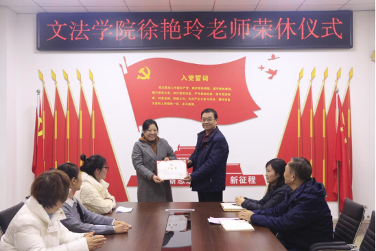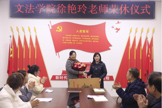 仪式上,院长周全星宣读了学校关于徐艳玲老师的荣休通知,详细介绍了徐艳玲老师的从教历程。院党委书记王新宇向徐艳玲老师颁发了荣休证书,并表达了诚挚的问候。文法学院分工会主席邵帅代表学院工会向徐艳玲老师敬献鲜花,并赠送纪念品。教师代表和学生代表分享了徐艳玲老师以老带新、教书育人的突出业绩。参会教师分享了徐艳玲老师在工作中给予的帮助与鼓励,并向她表达了感谢和祝福。